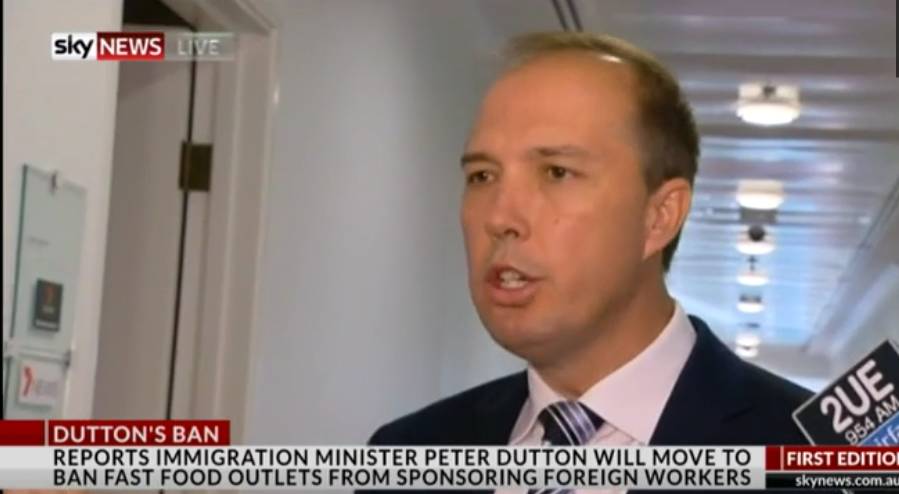 Mr.Dutton表示,在总统Turnbull的领导下,现在社会中的澳洲年轻人是最先应当得到考虑的!他们的工作机会比其他一切更加优先!尤其是快餐行业,特别适合年轻人从学生过渡到社会中。