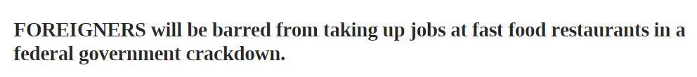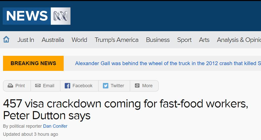 联邦政府将会禁止持有457签证的外国人在快餐行业工作!