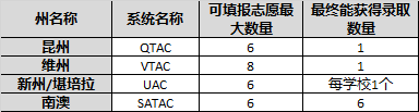 昆州的童鞋们是通过QTAC申请大学,每人一共可选6个志愿,根据志愿填报的顺序,学生只能收到1个录取。一般我们建议学生以1/2(冲击)+2/3(持平)+2(保底)的形式,根据自己的实际水平分散志愿选择。