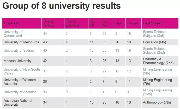 从上榜的学科数量来说,昆士兰大学是澳大利亚各高校之首。在所有48个学科中,昆大一共有44个学科上榜。其次是悉尼大学和墨尔本大学各有43个,蒙纳士大学有42个。