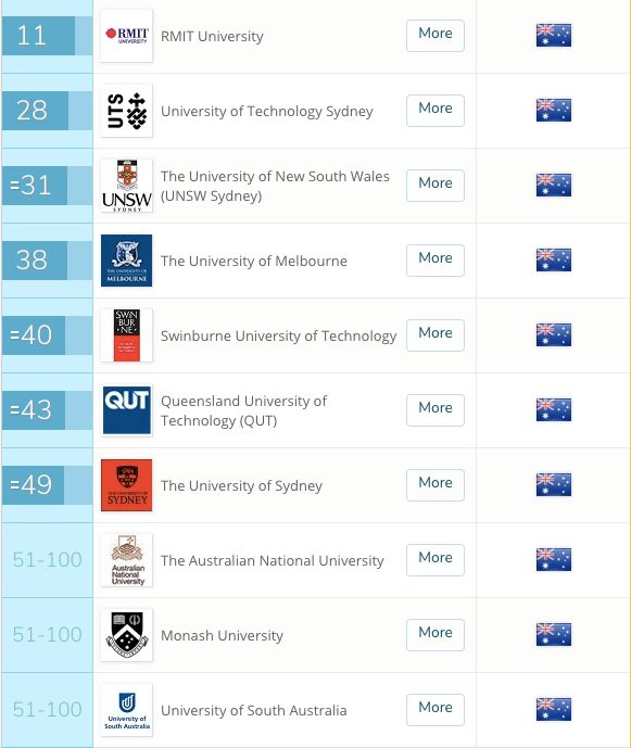 建筑学方面,悉尼大学、墨尔本大学、新南威尔士大学、墨尔本皇家理工大学和昆士兰大学都分别排进了世界TOP50。相较去年,排名都普遍有所提升。
