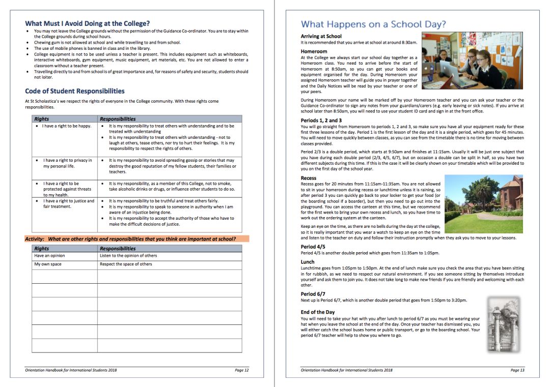 7年级课程:英语、数学、科学、宗教教育、历史、地理、设计和科技、个人发展–健康和体育、音乐、视觉艺术、戏剧8年级课程: