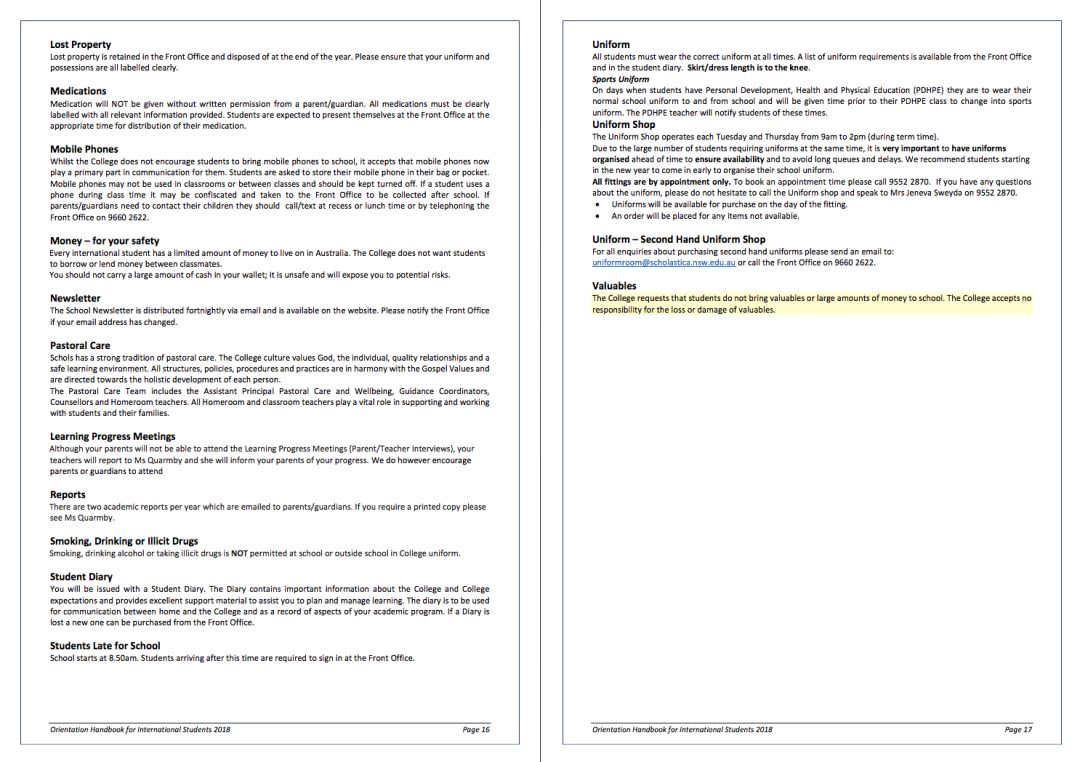 国际学生可以选择住校,也可以选择寄宿家庭。作为一所住宿女校,学校有2栋住宿楼合计100个校内住宿位置可以提供给学生,7-10年级的学生是是共享房间居住,11-12年级的高年级学生则住单人间。每个宿舍都有一个供住宿者放松的公共房间,包括有舒适的休息室,一个电视和DVD播放机和一个厨房。住宿生也可以进入学校和附近的地方设施,包括悉尼大学和州立图书馆、游泳池和其他体育设施。学生还允许在课余时间使用学校网络和互联网。学校住宿部配备有七名专职住宿监督员和一些临时住宿管理人员。每个宿舍和年组都有专门的监督员来满足女孩们的日常需要。他们早上叫醒女孩,下午回来迎接他们。住宿监督员制定年度小组的考核任务并付诸实施,工作人员积极跟踪女生的学业进度,并定期与她们进行日常交流,以确保她们步入正轨。