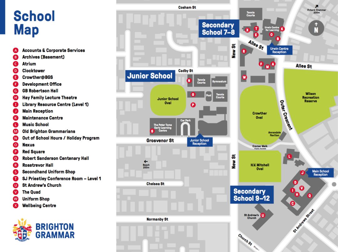 学校位于离墨尔本市中心南部仅20分钟车程的布莱顿区,离市中心约12公里。学校地址:90 Outer Cres, Brighton VIC 3186