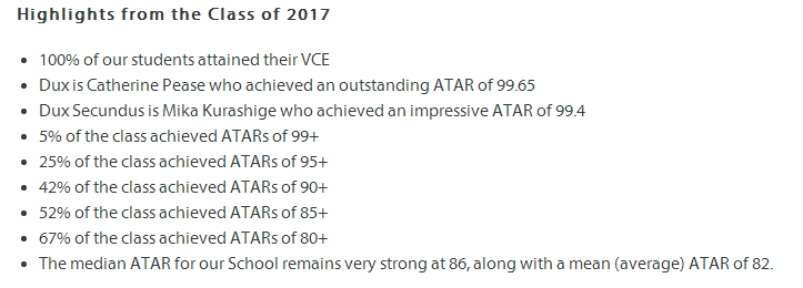 该校成绩在历年的VCE中的表现都十分抢眼,现以2017年 VCE 考试成绩为例,供大家参考一下: