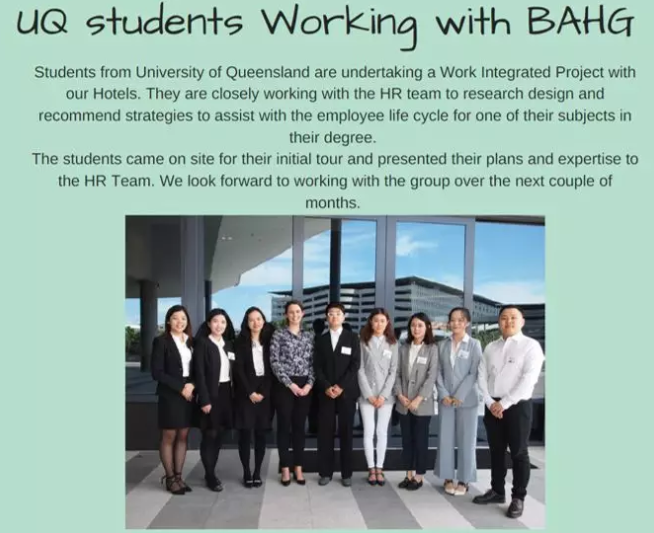 近期,我们的学生刚刚完成了与Brisbane Airports Hotels Group合作的一个项目。他们和该企业的HR团队紧密合作,研究、设计和推荐了针对员工生命周期管理的策略,最后递交的成果受到该集团的高度认可,并被其人力资源部门直接实施。通过一个学期高强度的项目运营,学生们深觉自己如同接受了“岗前培训”一样收获颇丰。