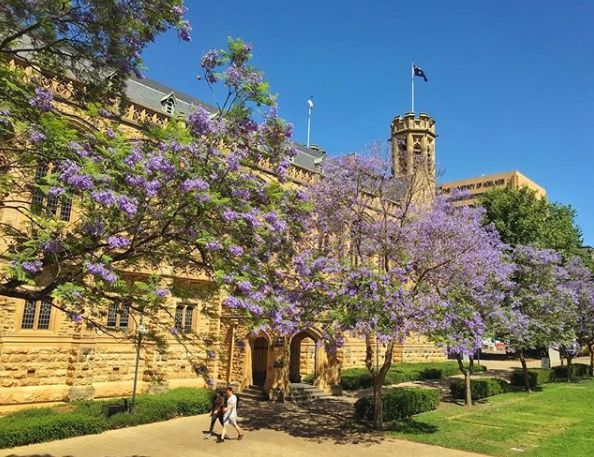 在阿德莱德市中心的North Terrace主校区上课,野鸭和水獭常常会在教室外的托伦斯河边乖巧地等你下课,而学校风景一年四季都美得让你迷醉,尤其是在蓝花楹盛开的季节里……
