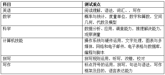 能力测试就是评估学生的口语表达和数字推理以及解决问题的能力;成就测试则旨在衡量学生的阅读理解、书面表达等。