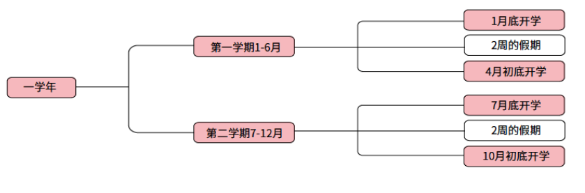 澳洲高中一年分为两个大学期,四个小学期。学生一般申请在大学期开学时入学。作为中学留学生,还会在正式开课之前完成语言学习。所以,建议有留学计划的家长至少提前1年开始咨询留学事宜,以顺利连接澳洲中学相应的年级。