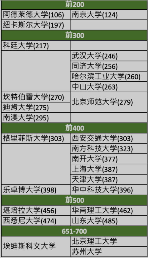 51-100: 科廷大学、阿德莱德大学、纽卡斯尔大学,坎特伯雷大学