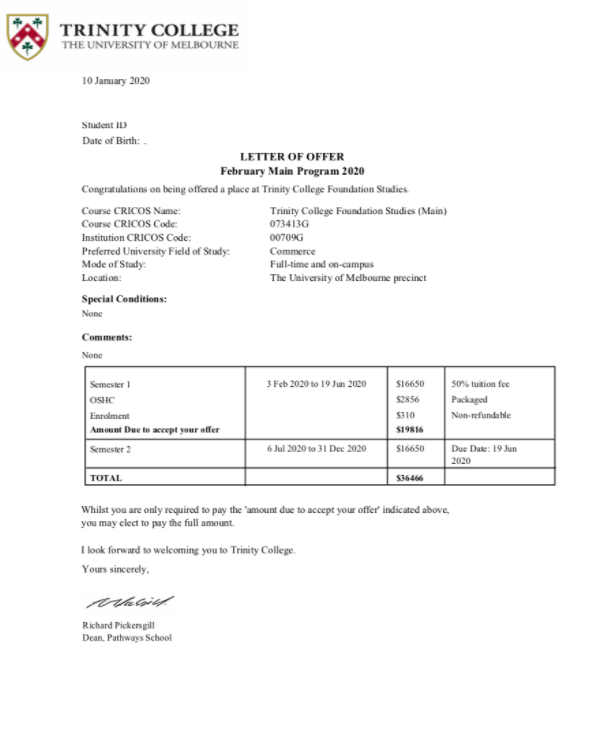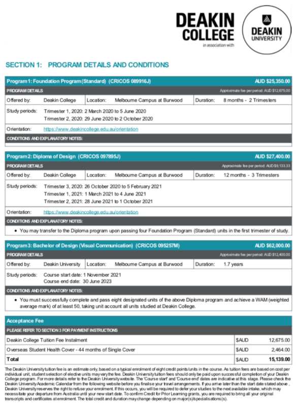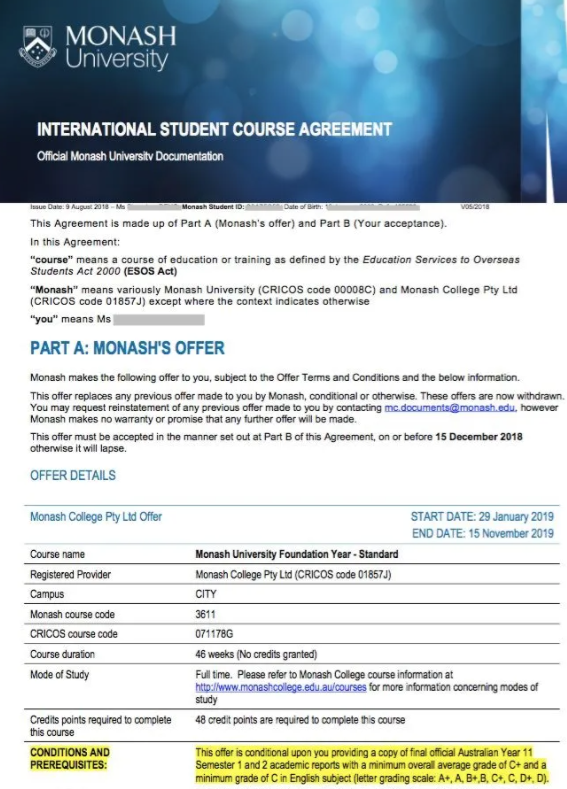 比如下面这位由澳思路办理成功拿到迪肯大学录取通知书的L同学。L同学为在澳洲就读完成11年级的国际学生,拿到的迪肯录取通知书为: